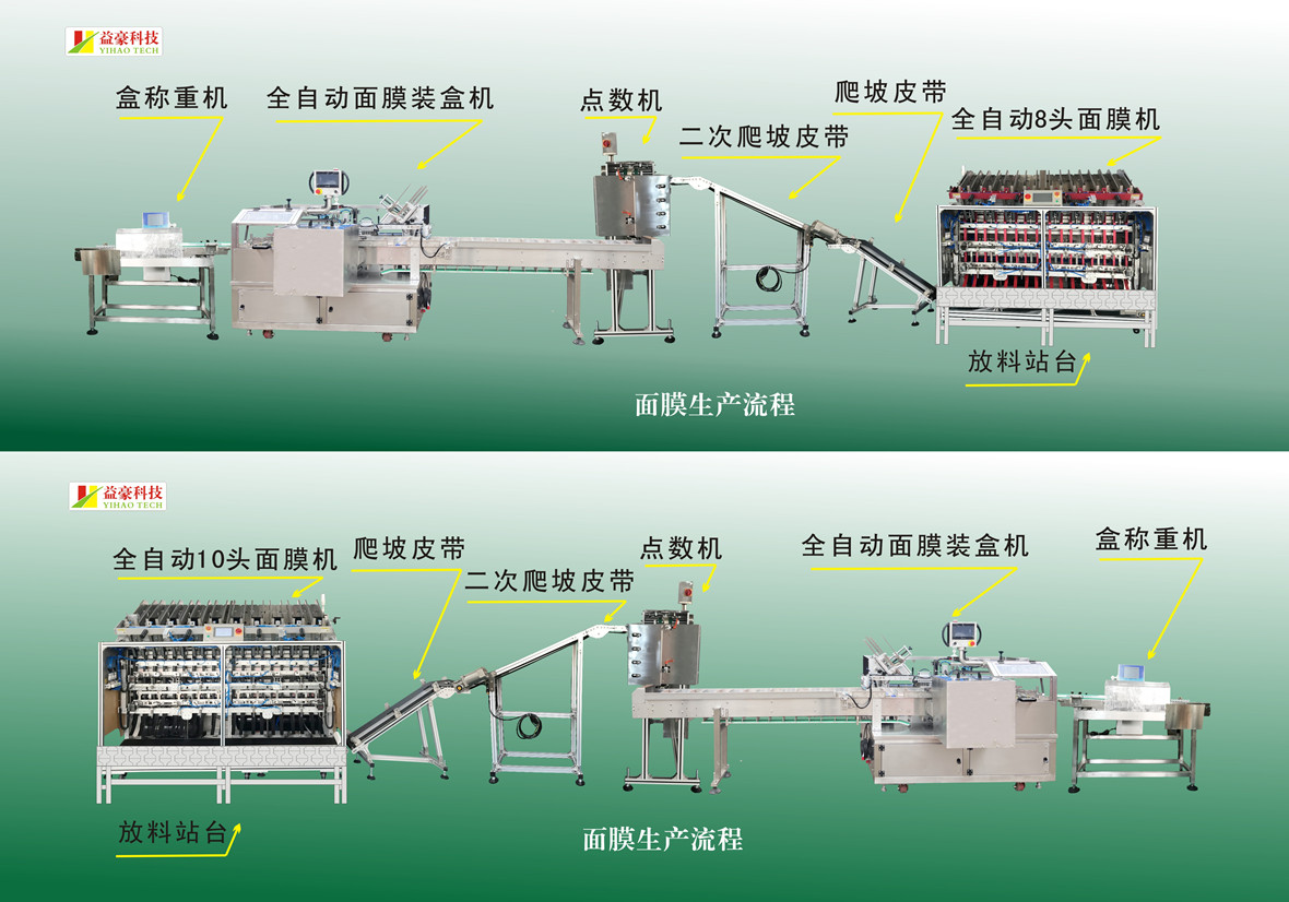 整線流程:面膜自動充填一封口一輸送一自動點數-自動裝盒-自動稱重一自動塑封一成品收集,二次爬坡皮帶:整齊的把灌裝好的面膜輸送到面膜點數機上。面膜點數機:對面膜進行點數堆疊,并自動放到裝盒機中。裝盒機:對上一工序點數好的面膜自動裝盒。