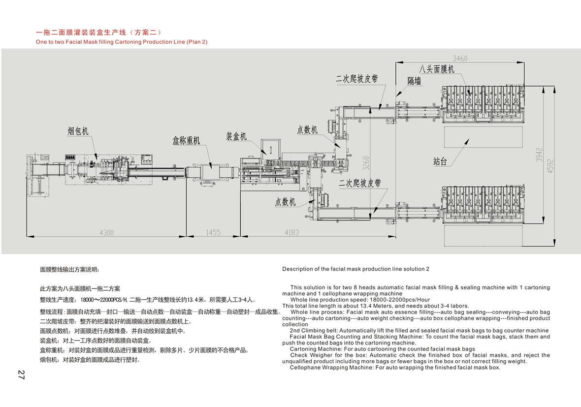 整線生產速度:18000~22000PCS/H 二拖一生產線整線長約13.4米,所需要人工3-4人。