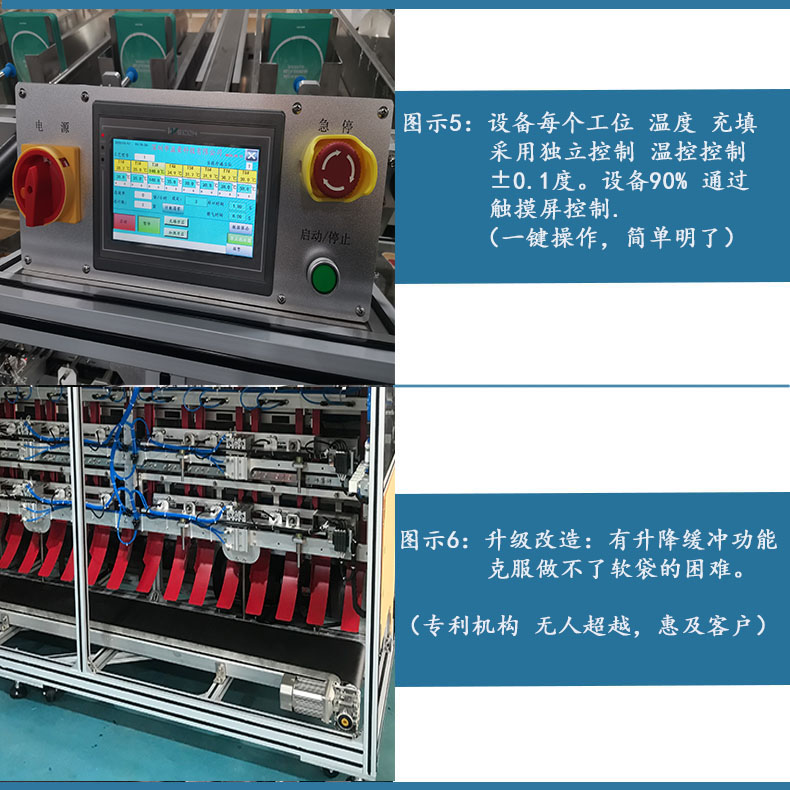 機(jī)器標(biāo)配升降定位緩沖,可以有效防止袋子掉落過(guò)程中的液體飛濺,