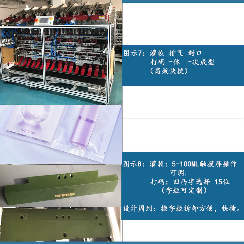 動(dòng)作流程 Working Procedure | 自動(dòng)下袋、自動(dòng)充填、自動(dòng)封口、打碼、成品輸出 Automaticbag feeding, liquidfilling, sealing, date coding and finish bag out feeding |