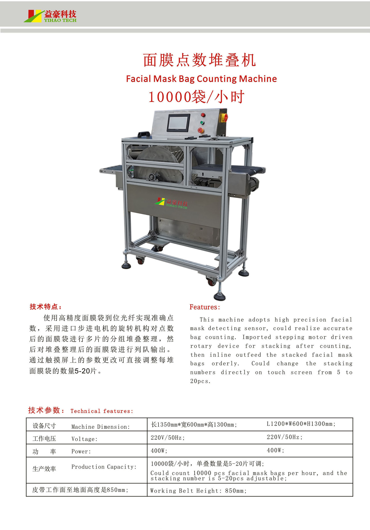 使用高精度面膜袋到位光纖實現準確點數,采用進口步進電機的旋轉機構對點數后的面膜袋進行多片的分組堆疊整理,然后對堆疊整理后的面膜袋進行列隊輸出。通過觸摸屏上的參數更改可直接調整每堆面膜袋的數量5-20片。